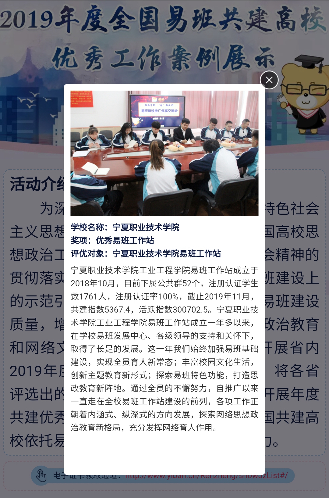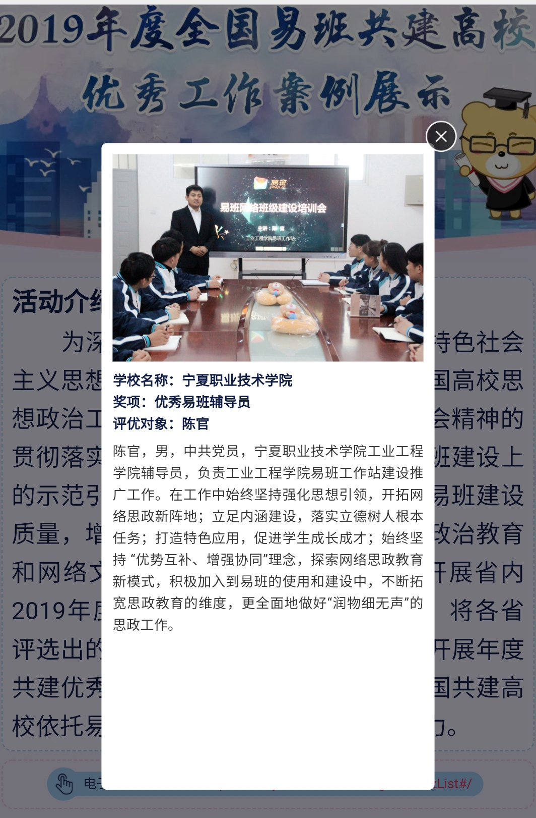 近日,教育部全国易班发展中心公布“2019年度全国易班共建高校优秀工作案例展示”评选结果。我校易班建设工作斩获多个奖项,其中,永利3044noc易班工作站荣获“自治区优秀易班工作站”,永利3044noc辅导员陈官荣获“自治区优秀易班辅导员”荣誉称号。