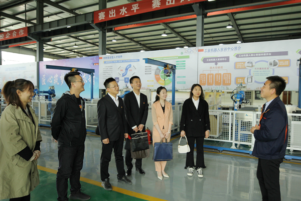 此次主题实践活动以重温入党誓词、集体学习、讲授专题党课、开展交流座谈的形式开展,两校青年教师代表面对鲜红党旗,重温入党誓词,共忆初心使命。共同学习习近平总书记对职业教育工作作出的重要指示。国网宁夏电力党校青年培训师杨秀川为在场青年教师讲解了“碳达峰、碳中和”相关知识,介绍了国网宁夏电力推动宁夏能源电力清洁低碳发展取得的主要成效和实现“双碳”目标的工作思路和举措,倡导青年人要树立绿色低碳的消费理念。国网宁夏电力党校党史党建高级培训师李晴霞讲授了《电力扶贫显真章,闽宁模式绽光芒》的专题党课,用详实的数据、真实的事例为大家讲解了脱贫攻坚的艰辛历程和电力扶贫的卓越成绩。随后,双方青年教师分享了开展党史学习教育以来各自的特色做法,交流了课程开发、教材编写、培训教学等方面的亮点经验,并针对“互联网+教学”、“VR在实操教学中的应用”等新兴领域进行了深入探讨。座谈过后,国网宁夏电力党校培训师参观了我校智能制造实训基地,观看了智能制造生产线的制造流程,与永利3044noc全国技能大师荆鑫进行了现场交流,并为我校开展校企合作“互联网+”技术远程实景教学平台点赞。双方青年教师表示要将学习交流成果运用到实际工作中,切实达到“学党史、强素质、见实效”的目的。