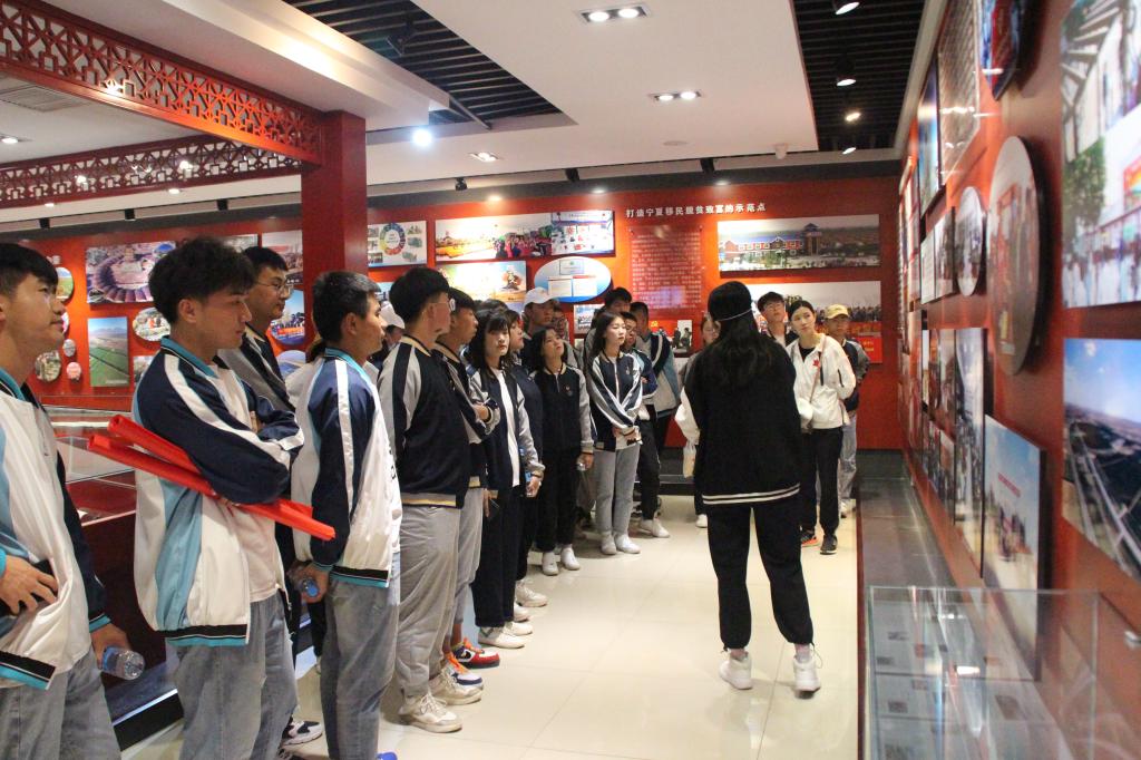 一路上,同学们满怀期待,兴奋不已。经过半个多小时的路途,师生们顺利抵达闽宁镇脱贫示范基地。在这里,大家参观了闽宁镇镇史馆,观看闽宁镇发展纪录片并认真听取了工作人员对该镇发展历史的详细介绍。