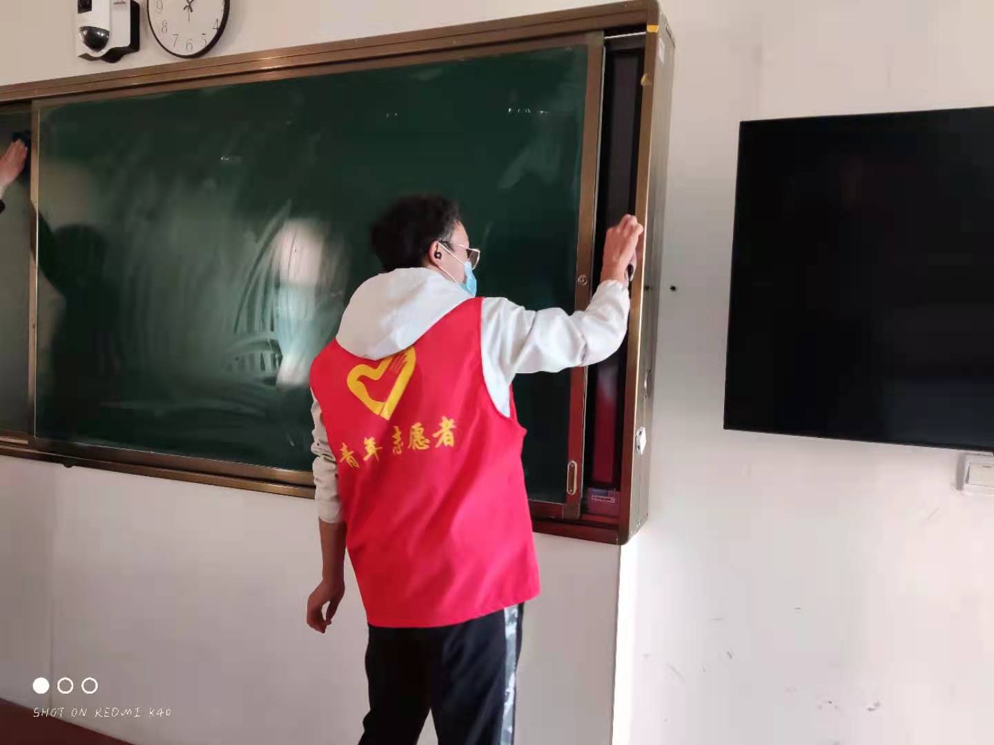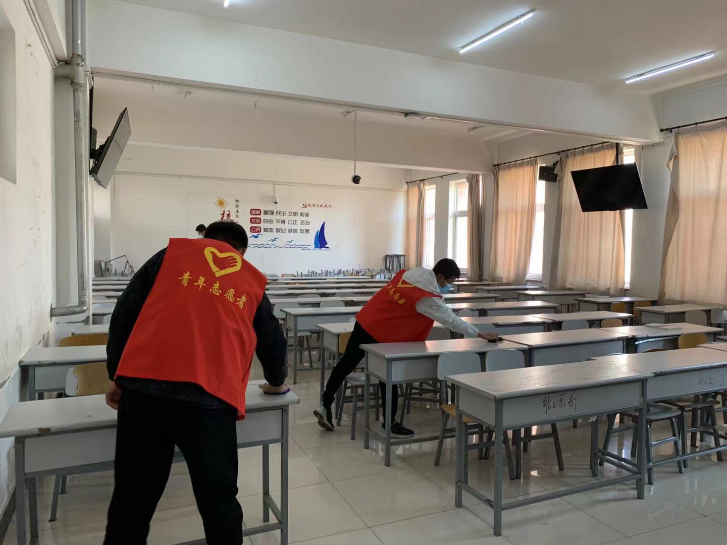 活动伊始,同学们积极要求加入到志愿服务队伍中来。工学院教室多、宿舍多,也是同学们学习、生活最重要的场所。志愿者们对教室、宿舍等区域进行了全面消杀,开窗通风,按1000ml水加一片消毒片的配比要求,喷洒地面、擦拭门把手、讲台、桌椅、窗台等地,对教学楼周围的垃圾、烟头也进行了清理。