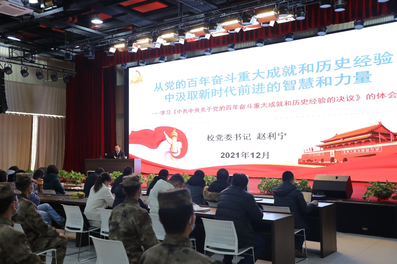为深入学习宣传贯彻党的十九届六中全会精神,进一步扎实推进党史学习教育,12月15日下午,学校党委书记赵利宁以“从党的百年奋斗重大成就和历史经验中汲取新时代前进的智慧和力量”为题,以学习《中共中央关于党的百年奋斗重大成就和历史经验的决议》的体会为主要内容,在纺织实训中心多功能厅为永利3044noc师生代表上了一堂精彩生动的党课。永利3044noc领导班子、教师党员、学生党员及师生代表参加了本次党课学习。工学院党总支副书记吴玉宁主持本次活动。