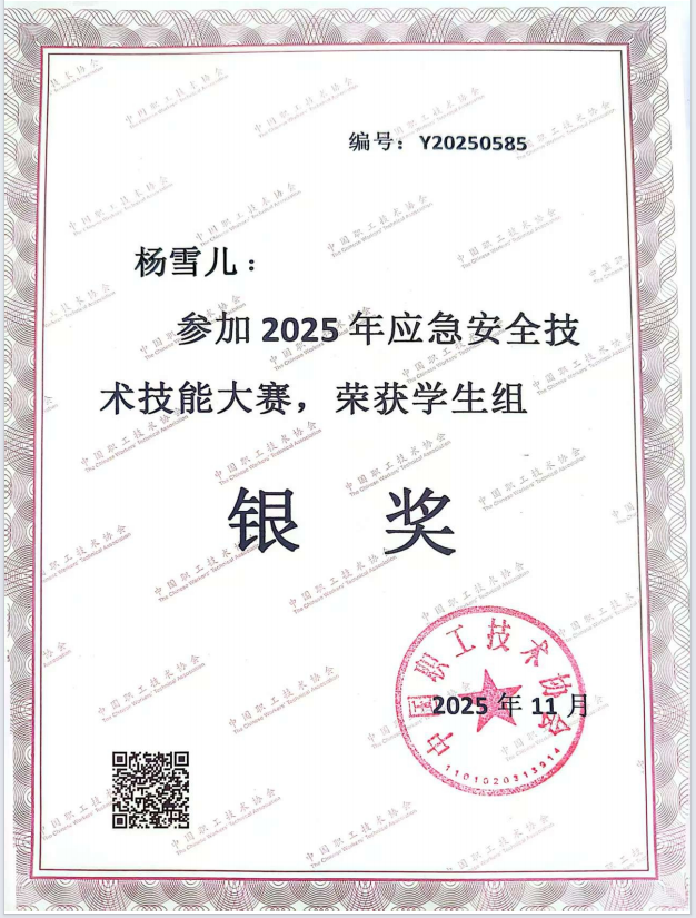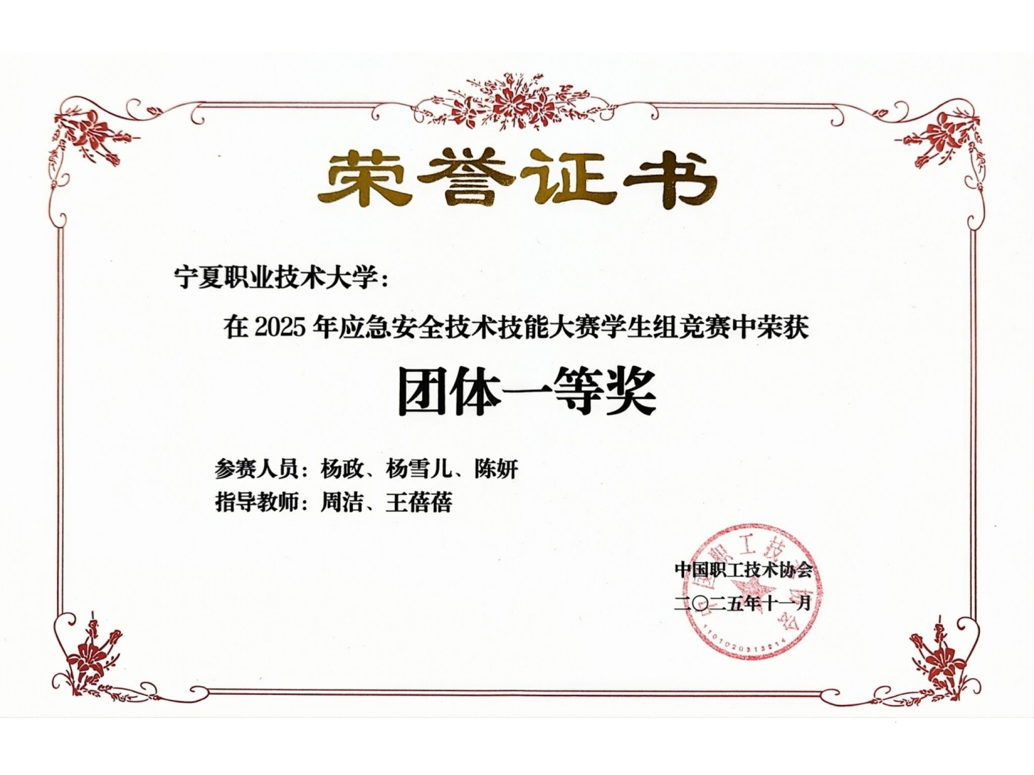 近日,2025年全国应急安全技术技能大赛决赛在河北省安全实训基地圆满落幕。由永利3044noc24级安全班杨雪儿、24级应化班杨政及陈妍组成的宁夏职业技术大学代表队凭借扎实的专业功底、默契的团队协作和出色的临场发挥,在全国众多参赛队伍中脱颖而出,斩获学生组团体一等奖第一名,同时收获个人金奖1项、银奖2项,用实力彰显了学校应急安全领域人才培养的过硬水准。